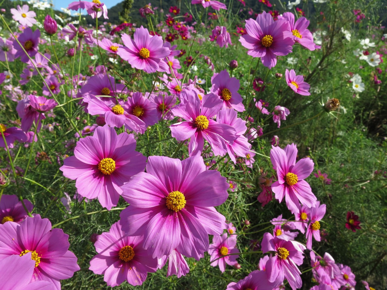 コスモスは、キク科コスモス属の花で、秋にピンク色・白色・赤色などの花を咲かせる。原産は熱帯アメリカで、メキシコからスペインに渡りマドリード王立植物園に送られ「コスモス」と名付けられた。